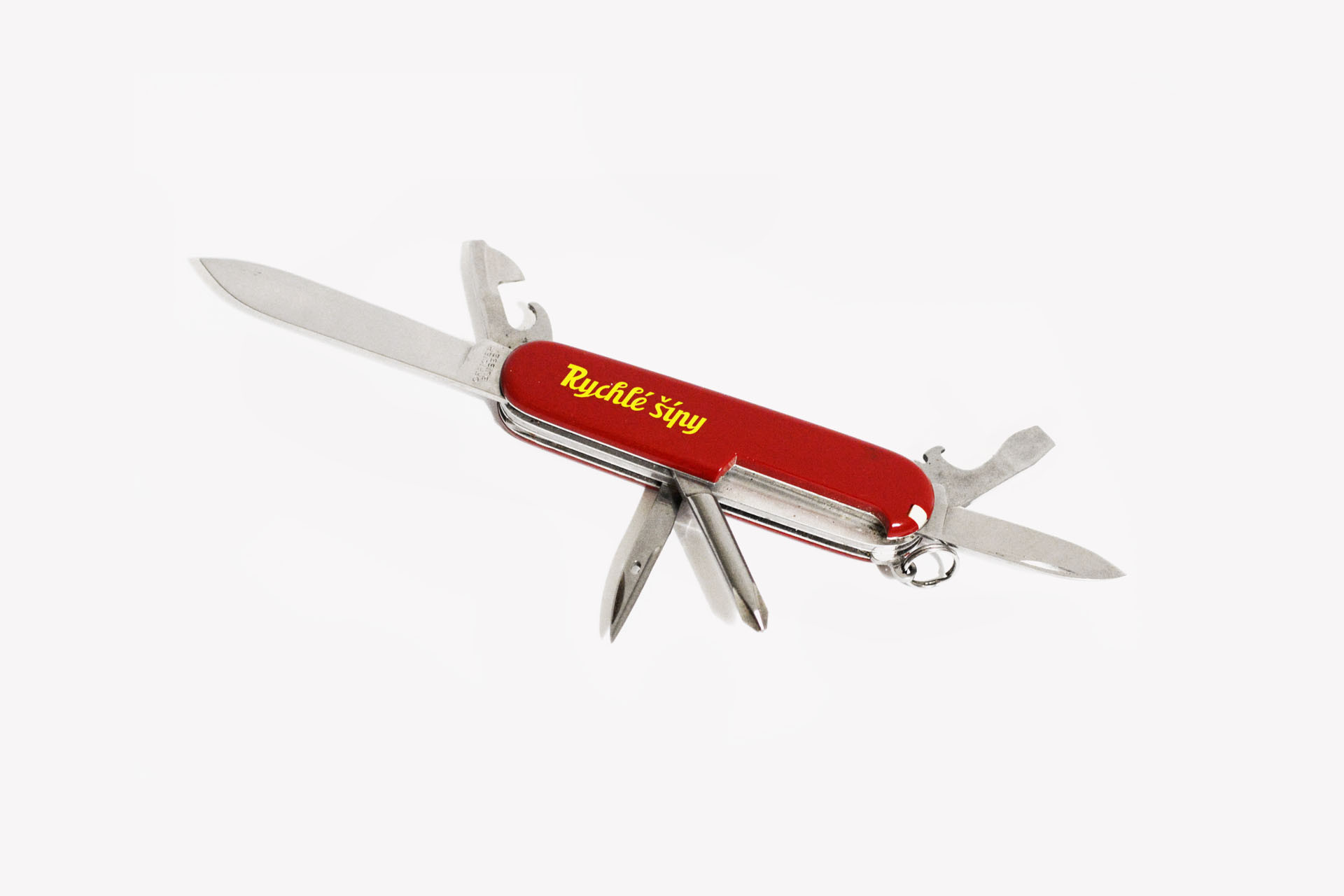 Velikost nože je 91 mm, váha 77 g. Se žlutým potiskem Rychlé šípy, dodávaný ve stylovém červeném pytlíčku.