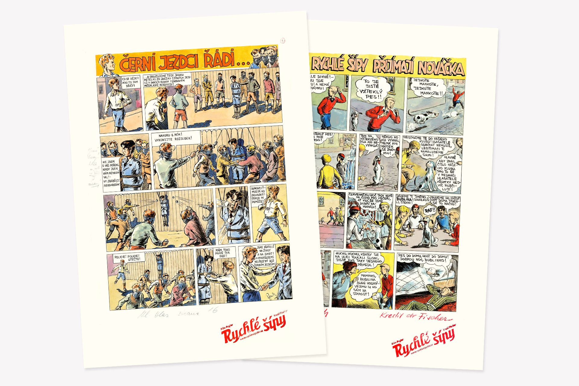 První příběh Rychlých šípů "Černí jezdci řádí" vyšel v Mladém hlasateli 17.12.1938 a odstartoval tak zrod legendárního seriálu. Nedlouho poté Rychlé šípy přijaly do svých řad nováčka a ne ledajakého - "toulavého a vzteklého" psa Bublinu, který s nimi prožil mnohá dobrodružství. "komiksový otec" Jan Fischer kreslil tyto příběhy na velký formát A2 a právě ona verze může viset ve vašem pokoji. Reprodukována 1:1, z originální kresby i s tiskařskými vpisky okolo, na kvalitním a pevném papíře.