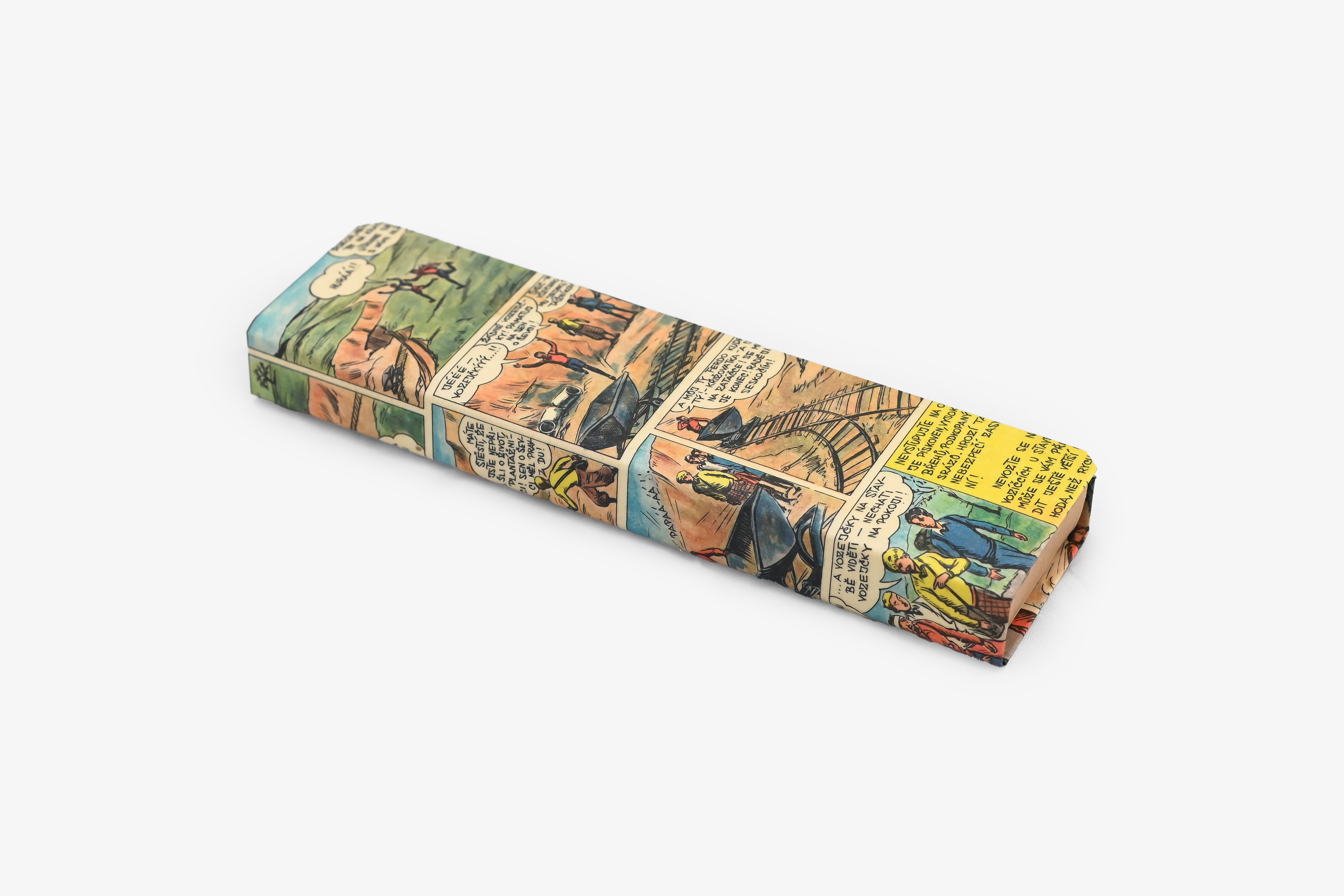 Papírové pouzdro na tužky z originálních komiksů Rychlé šípy, uvnitř doplněné třemi pastelkami z Jestřábova bytu.