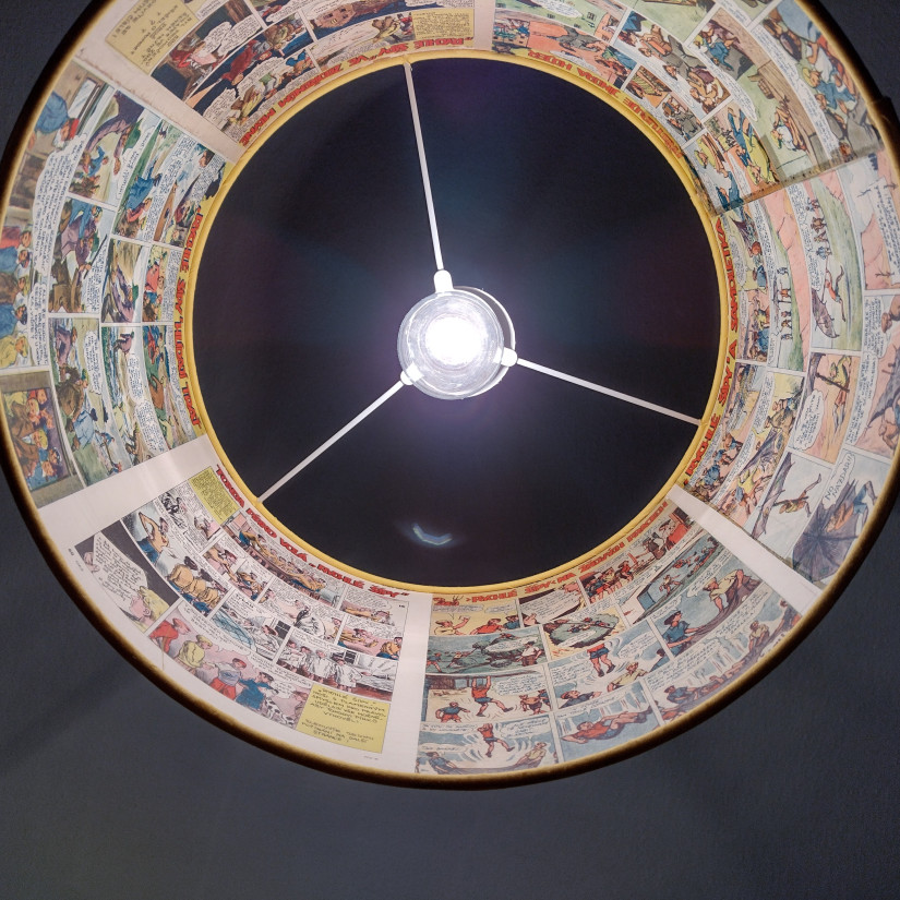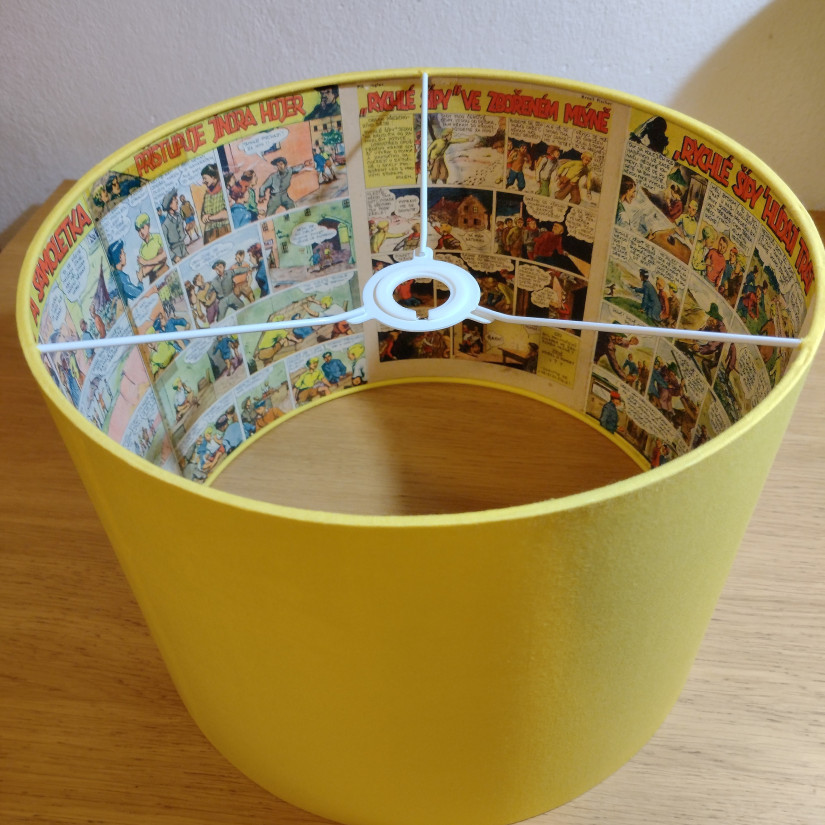 Stínidlo na lustr je o průměru 35 cm a výšce 25,5 cm je zvenku obaleno žlutým plátnem a zevnitř polepeno originálními příběhy Rychlých šípů ze starých vydání, kteří poskytli nadační příznivci